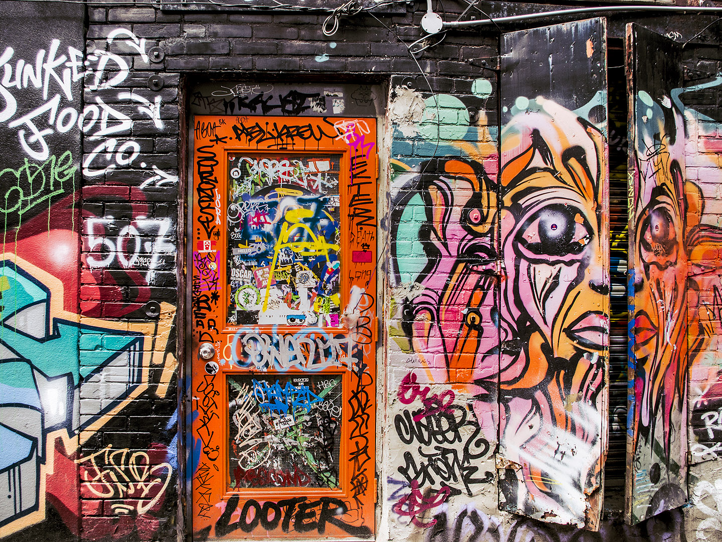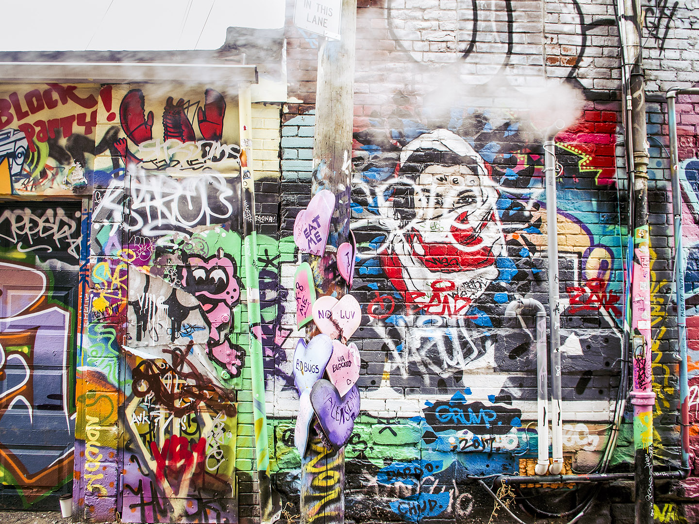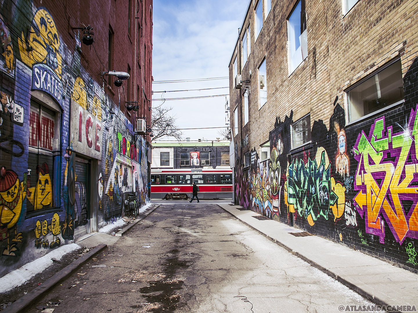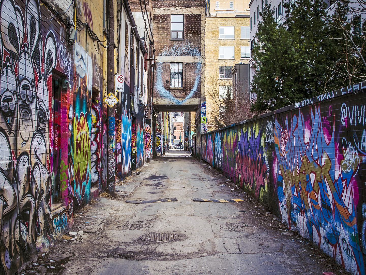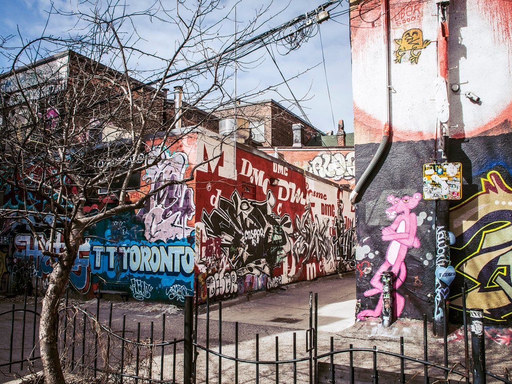 Our next stop was Graffiti Alley. On our way, we accidentally found the Toronto sign in Nathan Phillips Square. The square was full of ice skaters. Torontoโ€™s clean streets were more akin to a British city than anywhere weโ€™d been in America โ€“ a sort of cross between the two. The CN Tower rose tall above the city, visible from every gap between buildings.