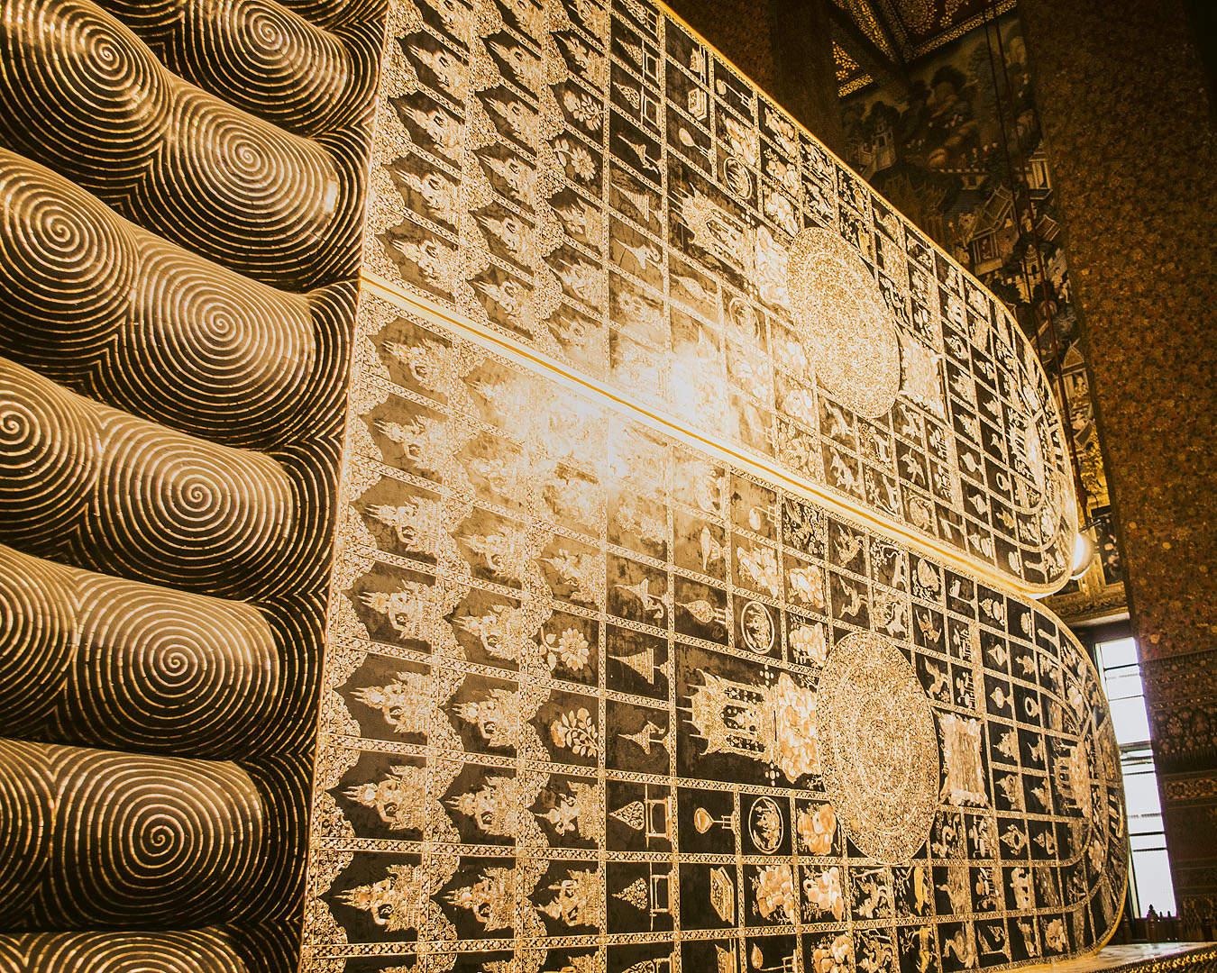 My last stop – and one of the main attractions at Wat Pho – was the Temple of the Reclining Buddha. I’d seen photos of it, but seeing it in reality was something else! At 46 x 15 m, it’s the largest Buddha image in Thailand and it really is huge. The feet alone are 5 m long! For comparison, I’m a bit over 1.7 m tall. I was the only tourist in the temple.