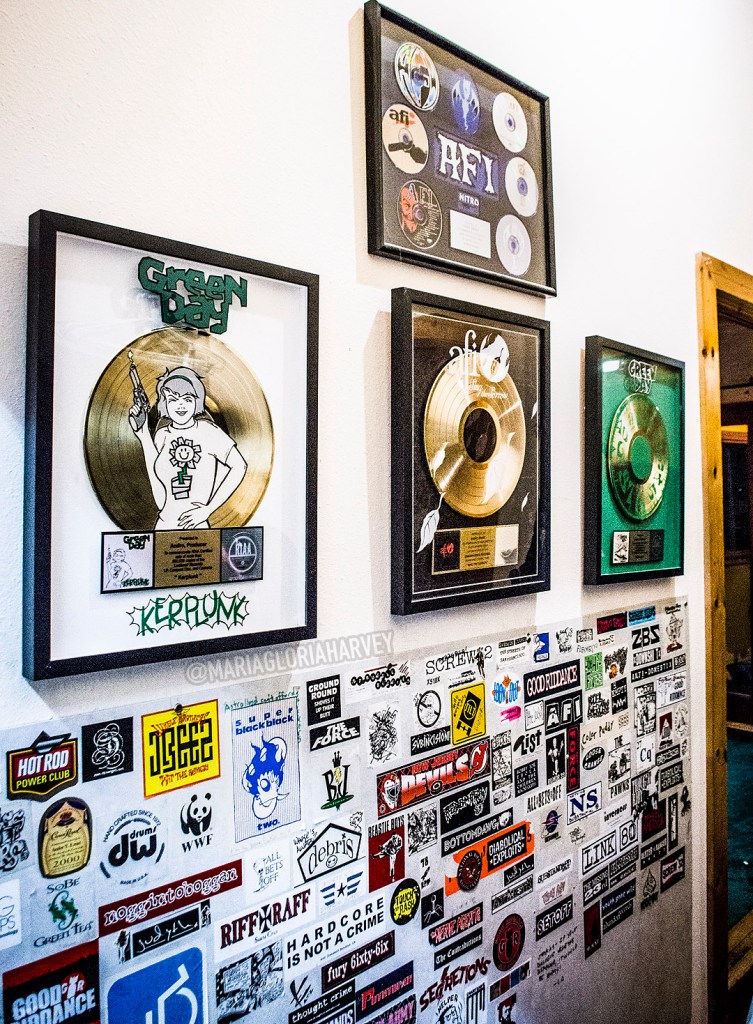 Most places, you visit and the only mark left by Green Day is the song playing in your mind. A cut-out of Billie Joe, ‘swearing’ he recorded at Art of Ears, greeted us as we walked in. Andro told us what a fast, one-take vocalist he was. Framed gold discs celebrated 39/Smooth and Kerplunk.
