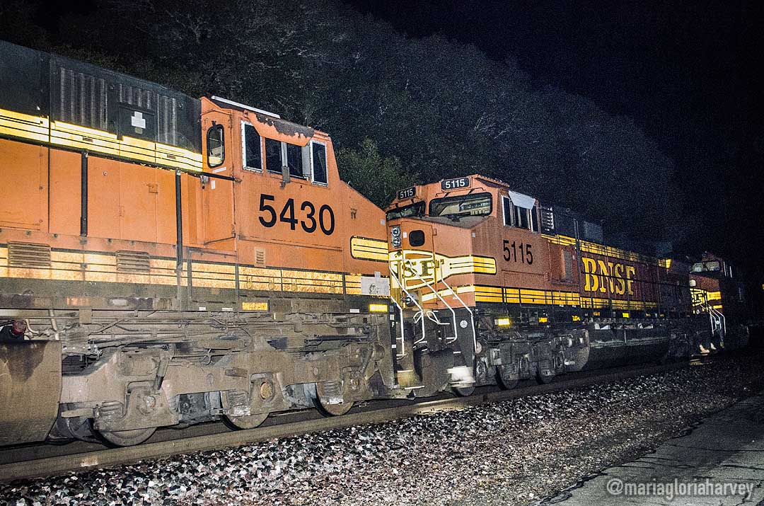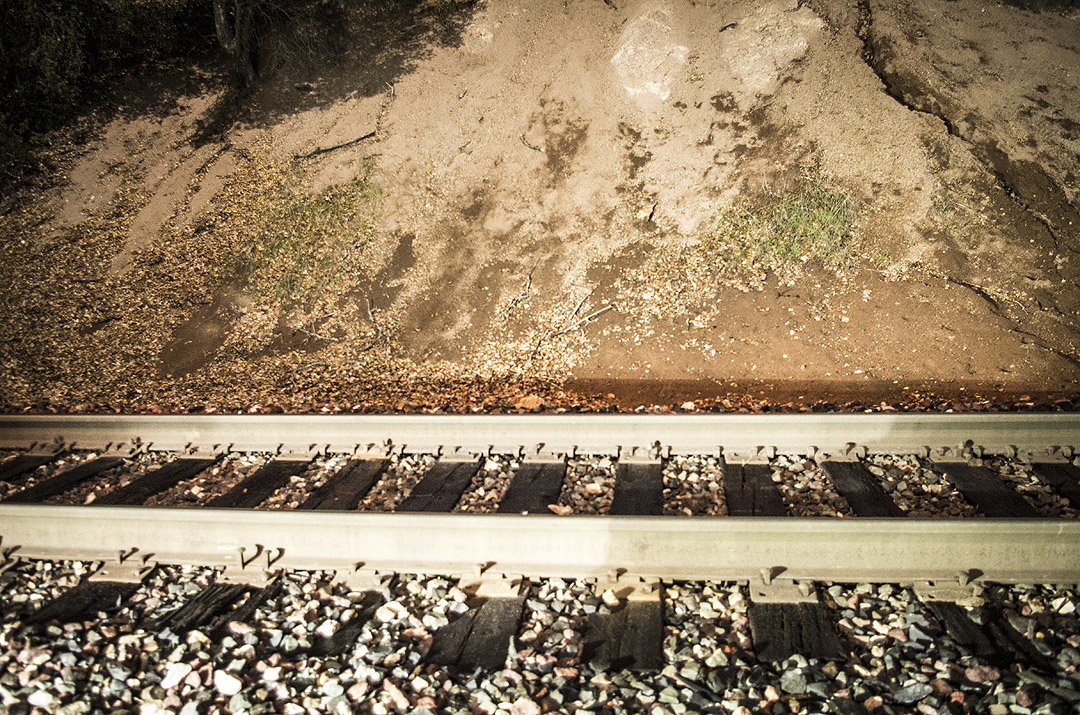 Almost back at the highway, we heard rumbling. Another horn. There was another train coming! This time we weren’t close enough to die. Claudia braked and I leaned out to take photos. They’d have been better with an external flash and finally replacing my kit lens, but hey, we have some photos of the train ‘rolling in.’