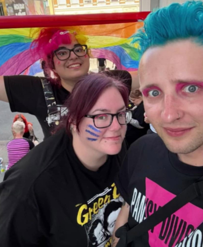 The titles Queue Dad, Queue King and simply Dadam have been applied to Adam thanks to his numbered list of everyone in the queue. In the afternoon, we made a short trip to Sarah’s hotel to ensure our make-up was as gay and obnoxious as possible (see photo). That pride flag didn’t survive entry though… it had to go in a bin.