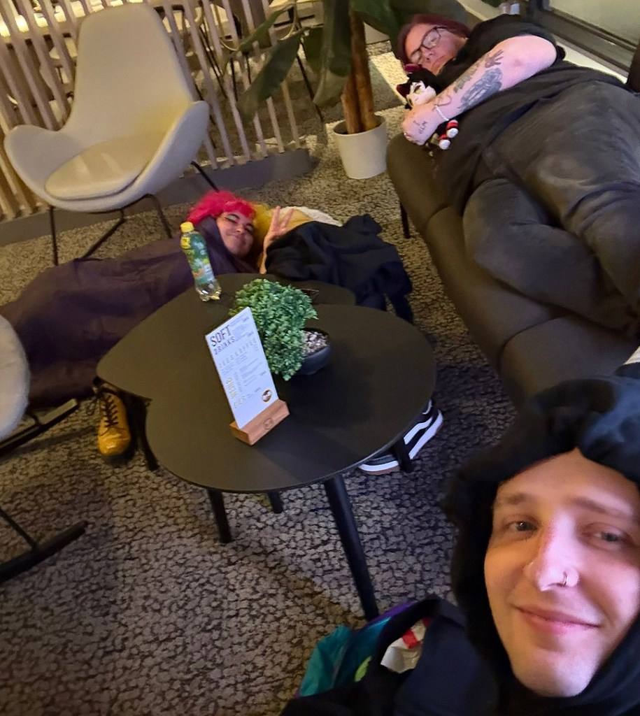 The sun set. As darkness descended, the area began to feel sketchy. We sang Jesus of Suburbia in full with an audience of some random middle-aged men smoking around a campfire, but eventually even they disappeared. There was no sign of anyone else at all, let alone other fans who intended to stay. Regardless, I unrolled my sleeping bag. Adam and Sarah moved to other benches, but Adam’s bench had cursed vibes, so he came back. It wasn’t very successful. None of us slept.
