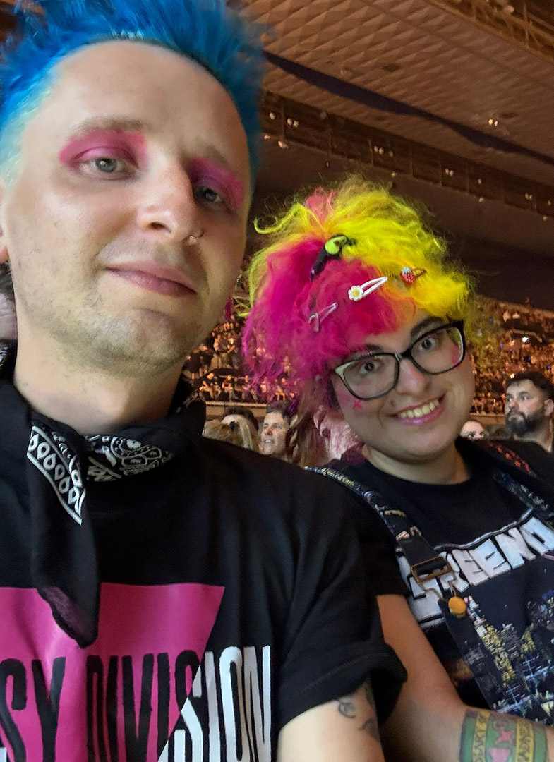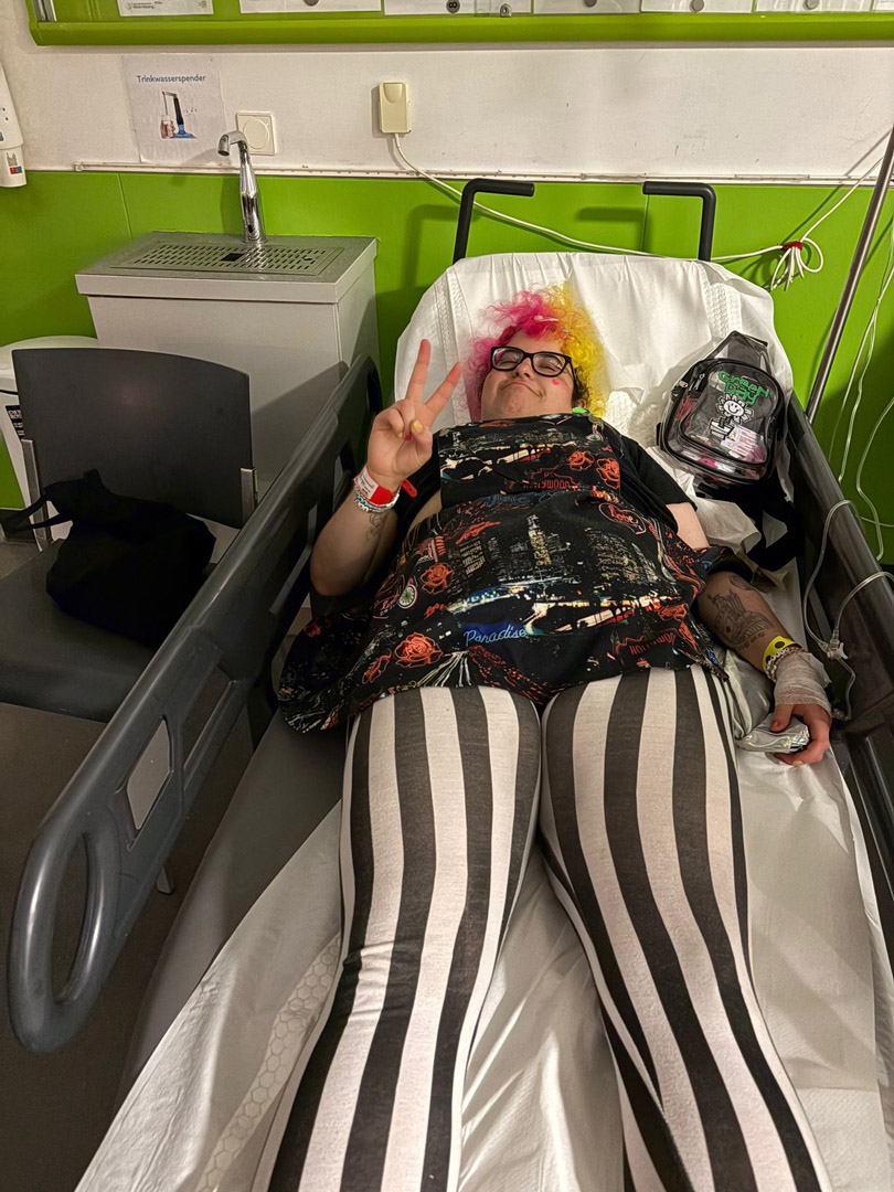 The doctor arranged a CT scan to ensure there was no brain damage. We returned to the waiting room with our disapproving audience. I don’t want to downplay how traumatic it must have been to witness the seizure – and in all honesty, I’m still a bit shaken myself – but I’m the kind of person who laughs at my misfortune, so at this point I could see the funny side. I mean, we did all that unnecessary camping. I had a seizure in the middle of talking about someone’s unfortunate hard-on. I asked which song I was pulled out in despite seeing the whole show. Then we ended up in a hospital wearing UV-reactive makeup. I think that was when I asked for a photo to commemorate the whole experience.