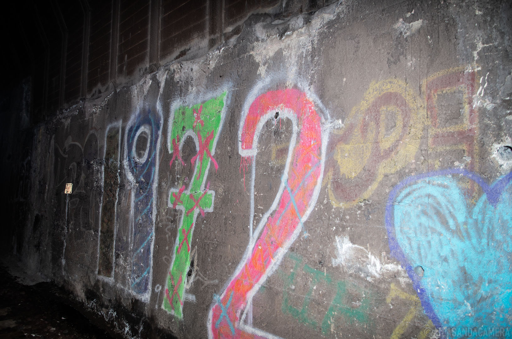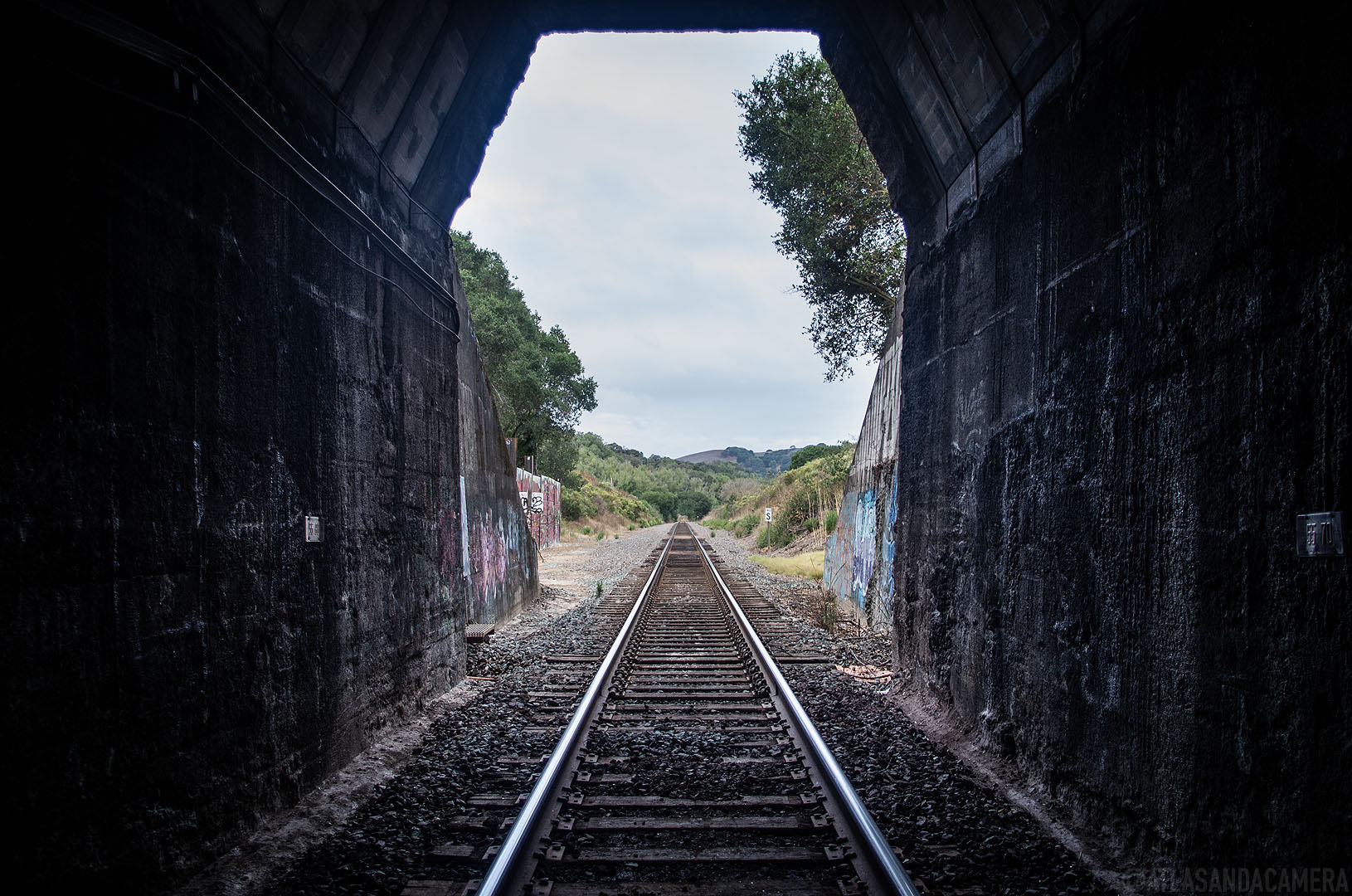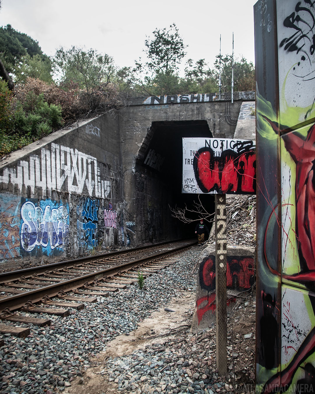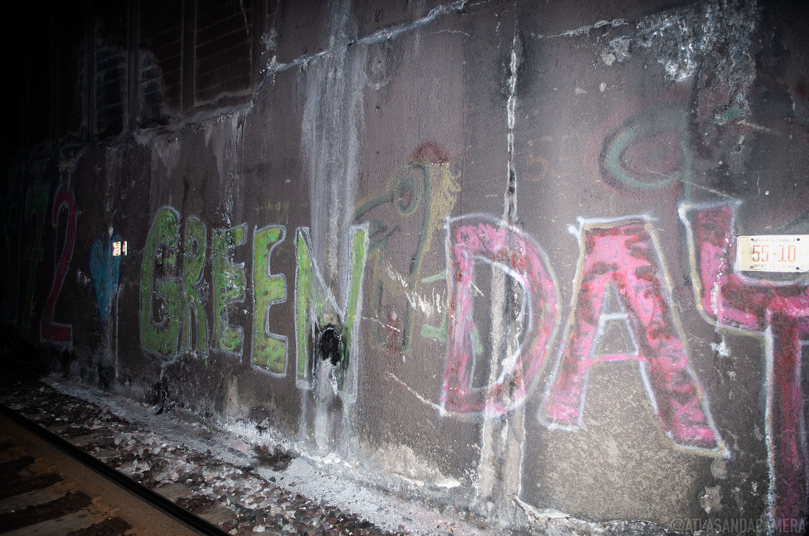 If you walk along (or beside) the tracks, rather than following the road, you’ll come to a tunnel. The walls are covered in graffiti by Green Day fans.