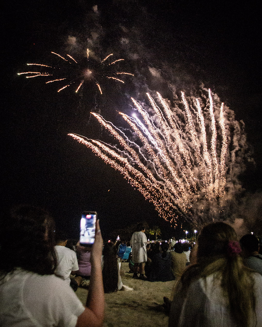 The fireworks started on time. Some people jumped up to try to get a better view, but I stayed where I was. It was a great view despite how crowded the beach was. The display lasted about 10 minutes. Very pretty.